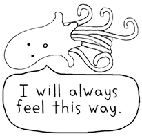 Depression also tells you: you have always felt this way. Looking forward and looking back, all you see are pitiful failures and moments shellacked in sadness. Your mind cannot access or imagine a different state of being.